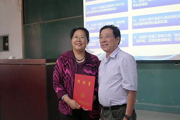 2014年9月13日,應(yīng)長春工程學(xué)院邀請,我公司董事長周和生先生為該校管理學(xué)院學(xué)生講授“建設(shè)項目投資管理及審計信息化”課程,且受聘為長春工程學(xué)院客座教授。我司向長春工程學(xué)院捐贈“建設(shè)項目全過程投資管理及審計系統(tǒng)”軟件(價值145萬元),大力支持該校教學(xué)工作。